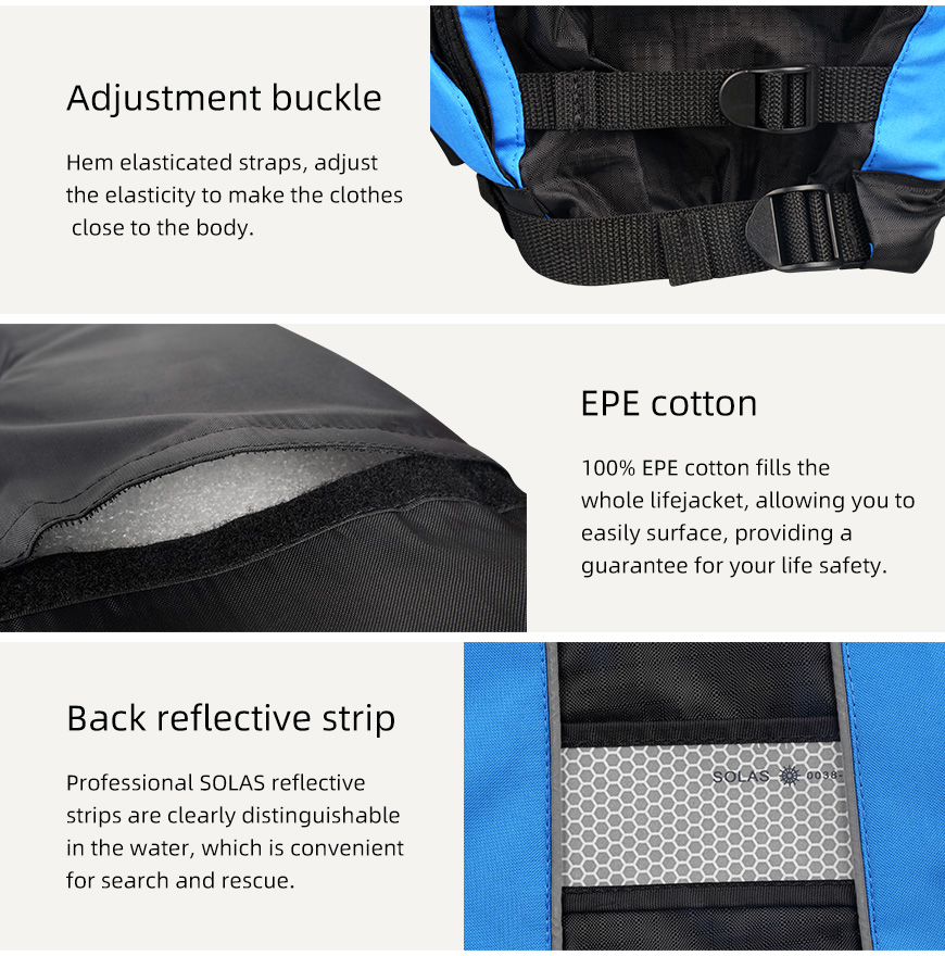 100% EPE cotton fills the whole lifejacket, allowing you to easily surface, providing a guarantee for your life safety. Professional SOLAS reflective strips are clearly distinguishable in the water, which is convenient for search and rescue. Plastic-steel zipper, no chain clips, no fading for a long time. A special rubber block for fish hooks is placed on the chest, and the fish hooks are not easy to lose. Hem elasticated straps, adjust the elasticity to make the clothes close to the body.