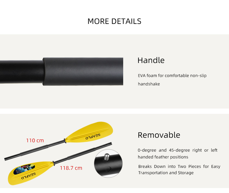 A durable high angle paddle with reinforced fiberglass polypropylene blades and aluminum shaft. Surprisingly lightweight for an aluminum paddle. Good value for paddle! The blades are designed for high angle strokes. This kayak paddle is great for flat water conditions and touring. It features a three-hole button system with 0-degree and 45-degree right or left handed feather positions. The efficient blade design makes the most out of every paddle stroke.